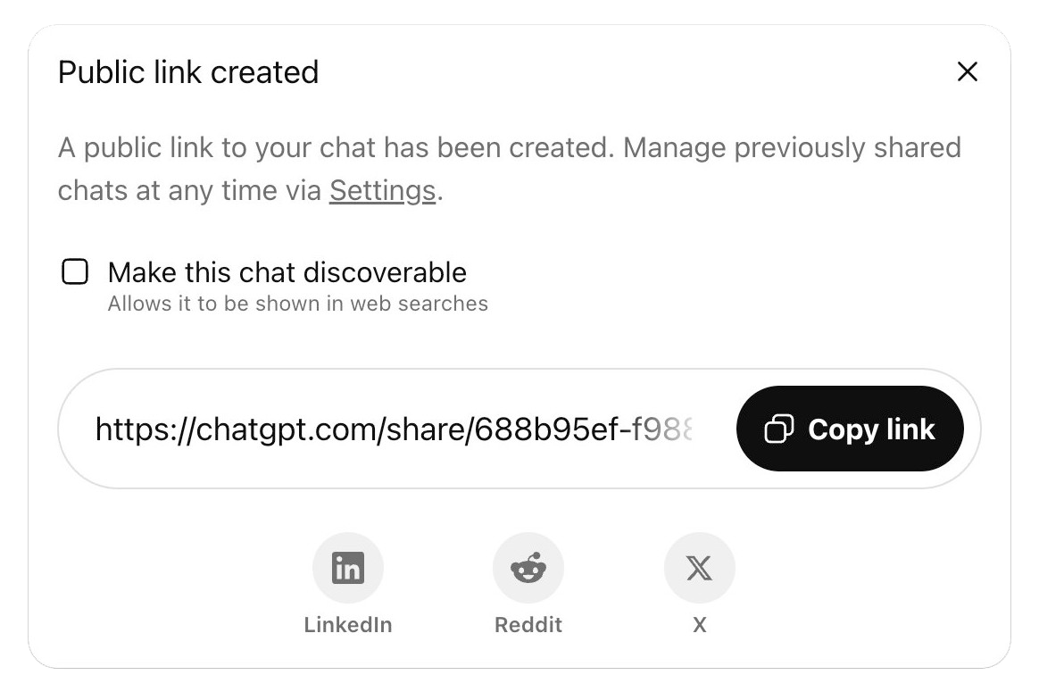 OpenAI conveniently provided you an option to do that. However, buried in the fine print, was a tiny checkbox saying “Make this chat discoverable. Allows it to be shown in web searches”. It all fairness to the designer, it was not checked by default. Many users – bless their optimistic souls – checked the box and thought, "well, what's the worst that could happen?". The worst was about to happen.