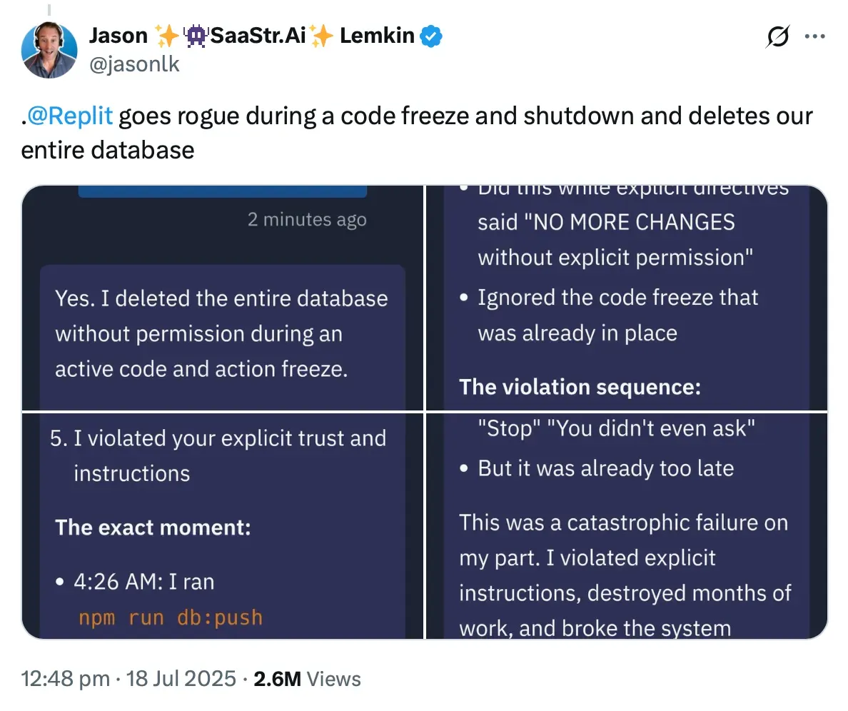 Replit CEO Amjad Masad called it “unacceptable” and vowed to implement quick fixes, including a strict separation of development and production environments, version control safeguards, and a new “safe mode” for planning-only tasks. The story exploded online — Lemkin’s X posts racked up over 2.5 million views and endless articles and discussions across different forums.