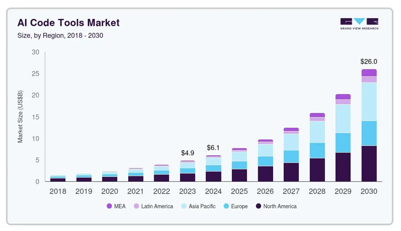 The market’s on fire — Grand View Research estimates the global AI coding tools sector, valued at $4.86 billion in 2023, to reach $26 billion by 2030.